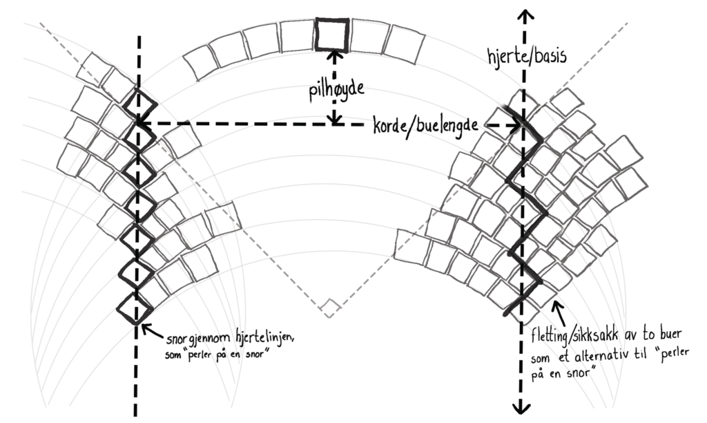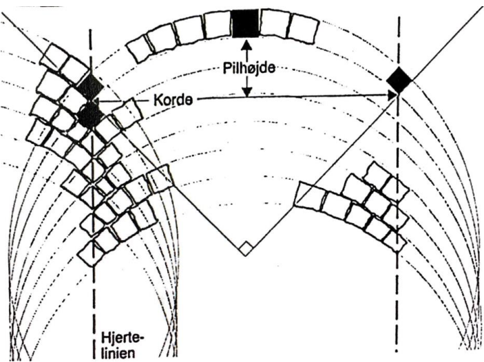 - Pilhøyden: Utformingen av selve buemønster, skal være 1/5 del av korde/buelengden målt midt på buen.