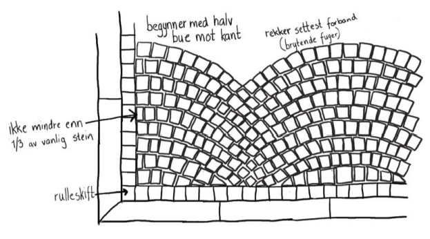 - Arbeid utføres på utsiden av buen og stein lagres på allerede lagt stein (se bilde under).