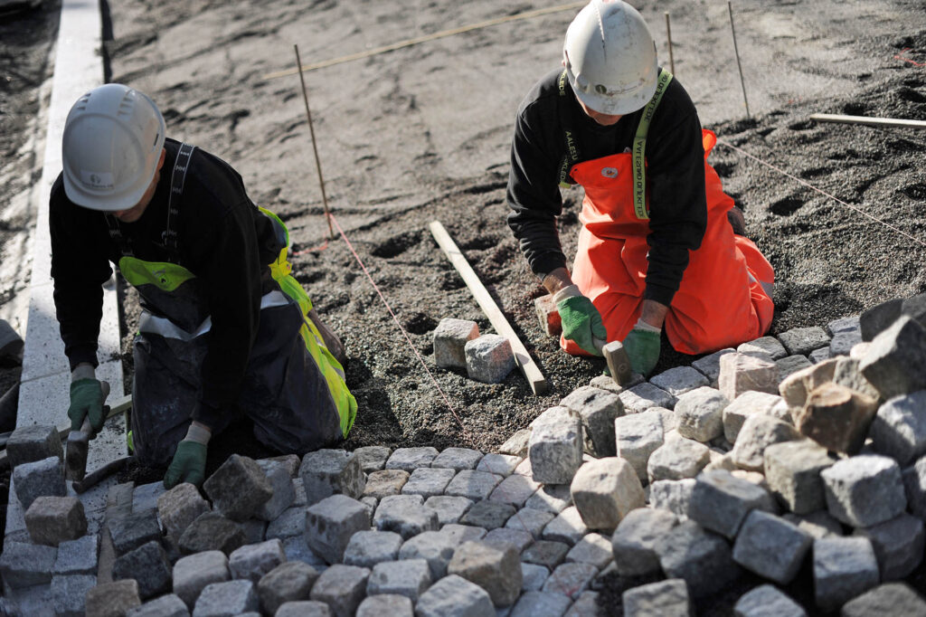 Fig. 9: En håndlanger får frem og tilrettelegger steinen slik at det blir god flyt i arbeidet.