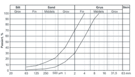 Fig. 4: Grensekurver for korngradering for settelag (0/8 mm) (Statens Vegvesen, Håndbok 018). Horisontal linje (leses først) viser kornstørrelsen og vertikal linje viser hvor stor prosentandel finstoff det finnest i massen.